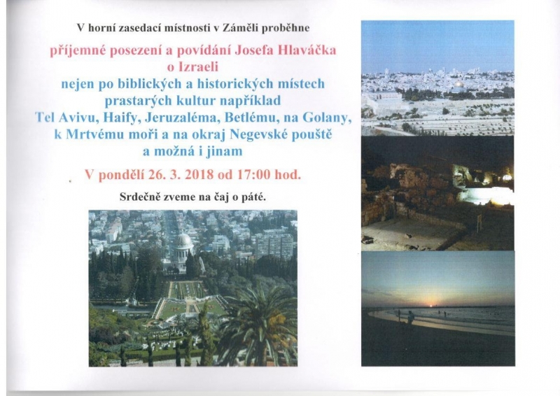 V pondělí 26. 3. 2018 od 17:00 hod. v horní zasedací místnosti v Záměli proběhne příjemné posezení a povídání Josefa Hlaváčka o Izraeli nejen po biblických a historických místech prastarých kultur například Tel Avivu, Haify, Jeruzaléma, Betlému, na Golany, k Mrtvému moři a na okraj Negevské pouště a možná i jinam. Srdečně zveme na čaj o páté. leták zde