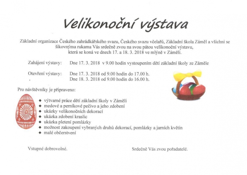 Základní organizace Českého zahrádkářského svazu, Českého svazu včelařů, Základní škola Záměl a všichni se šikovnýma rukama Vás srdečně zvou na svou pátou velikonoční výstavu, která se koná ve dnech 17. a 18.3.2018 ve mlýně v Záměli.