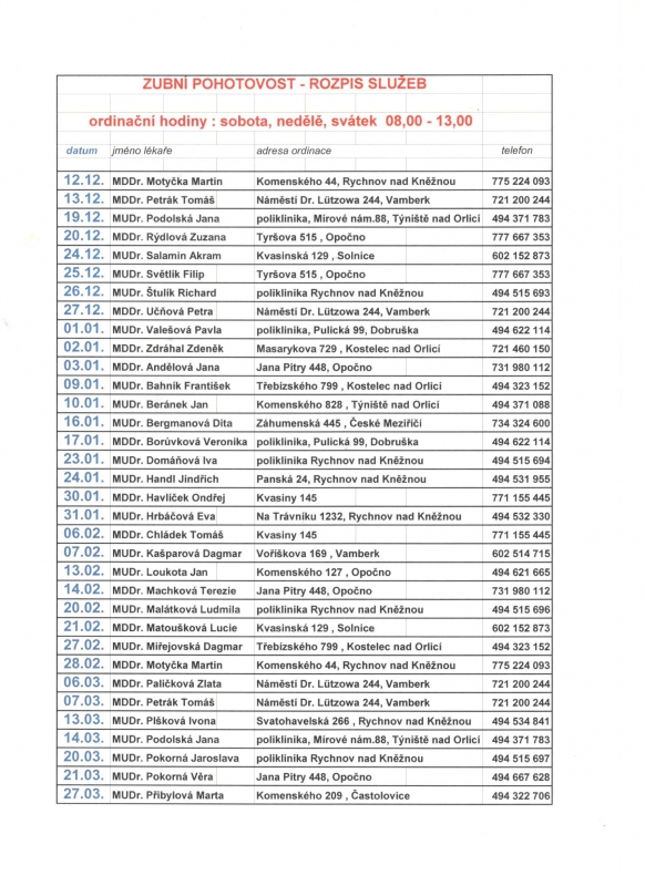 Zubní pohotovost - rozpis služeb od12.12. - 27.3.2021