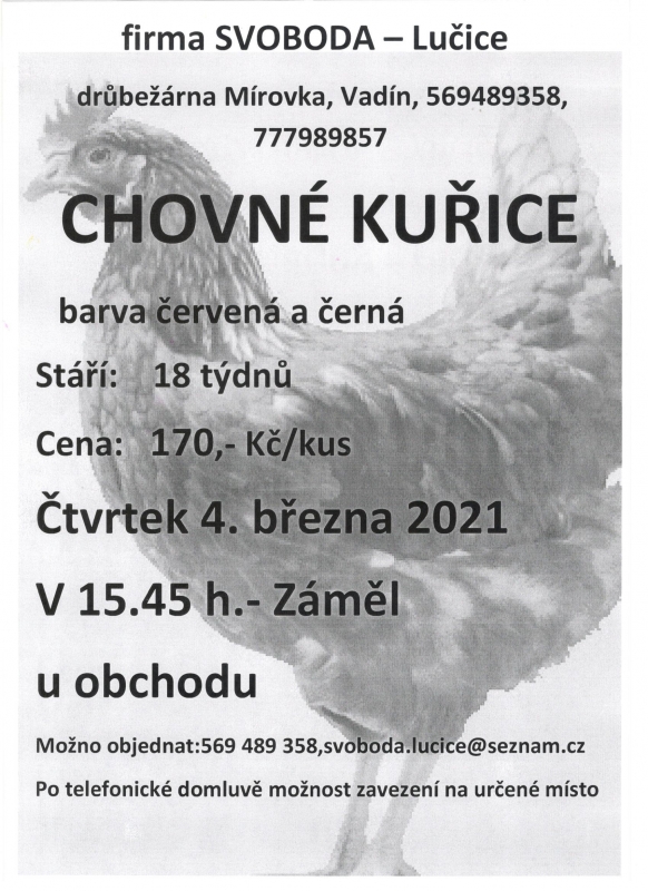 Chovné kuřice 4.3.2021 v 15:45 hod. u obchodu