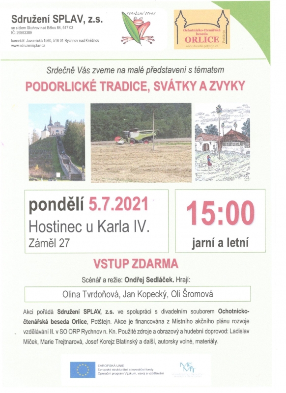 Akci pořádá Sdružení SPLAV z.s. ve spolupráci s divadelním souborem Ochotnicko-čtenářská beseda Orlice, Potštejn. Akce je financována z Místního akčního plánu rozvoje vzdělávání II. SO ORP Rychnov nad Kn. Použité zdroje a obrazový a hudební doprovod: Ladislav Miček, Marie Trejtnarová, JOsef Korejz Blatinský a autorsky volné, materiály. leták zde