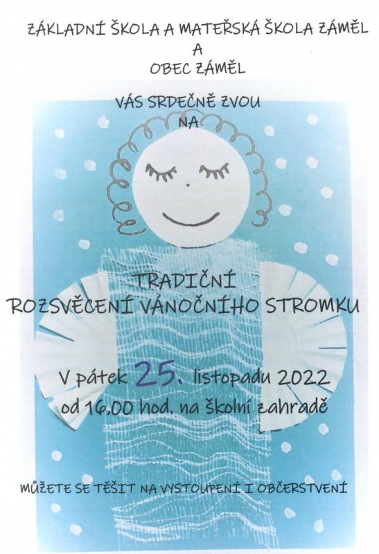 Základní škola a mateřská škola Záměl a Obec Záměl Vás srdečně zvou na tradiční rozsvěcení vánočního stromkuv pátek 25.11.2022 od 16:00 hod. na školní zahradě můžete se těšit na systoupení i občerstvení