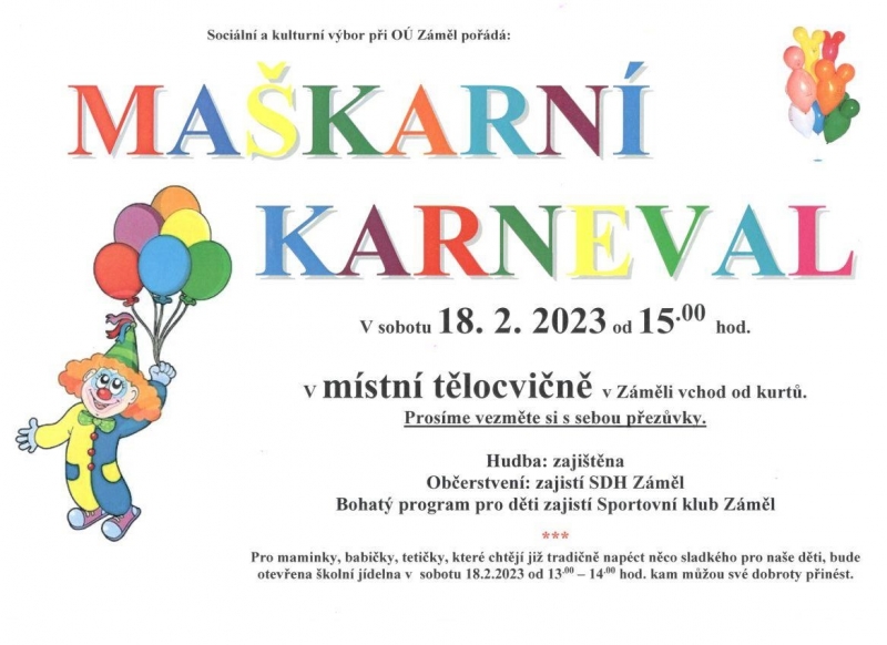v sobotu 18.2.2023 od 15:00 hod. v místní tělocvičně v Záměli vchod od kutů Prosíme vezměte si s sebou přezůvky. Hudba zajištěna.