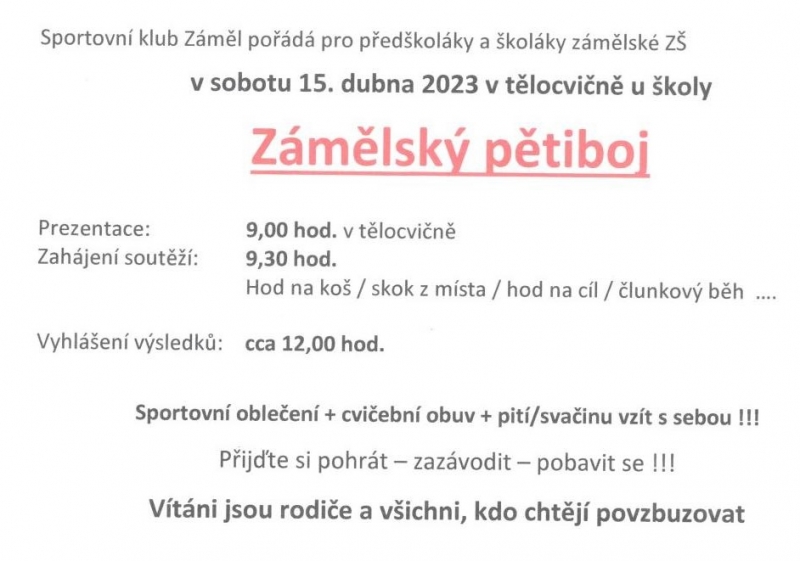 Zámělský pětiboj v sobotu 15.4.2023 od 9:00 hod.