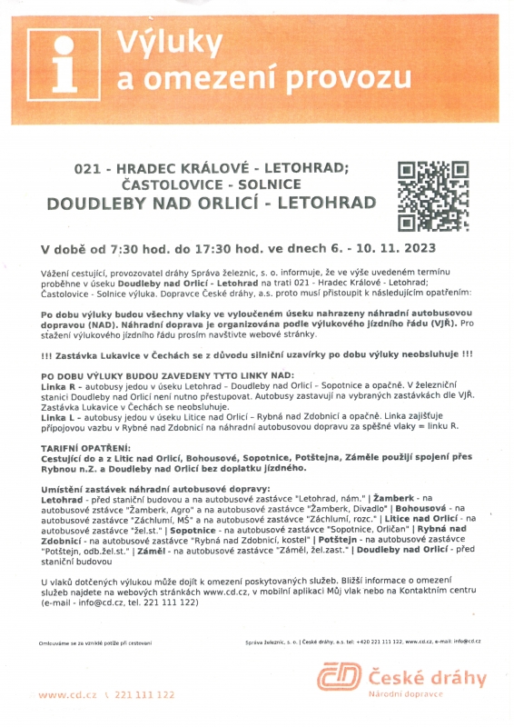 Výlukový jízdní řád ČD od 6.11.2023 do 10.11.2023