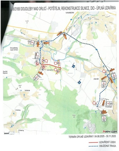 Úplná uzavírka silnice Doudleby n.O. - Potštejn - Záměl od 4.8. do 30.11.2025