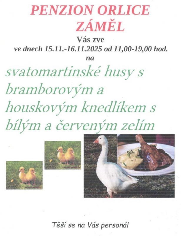 Svatomartinská husa - Penzion Orlice ve dnech 15.11. - 16.11.2025 od 11:00 - 19:00 hod.