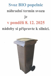Náhradní termín svozu je v pondělí 8. 12. 2025 nádoby si připravte k silnici.