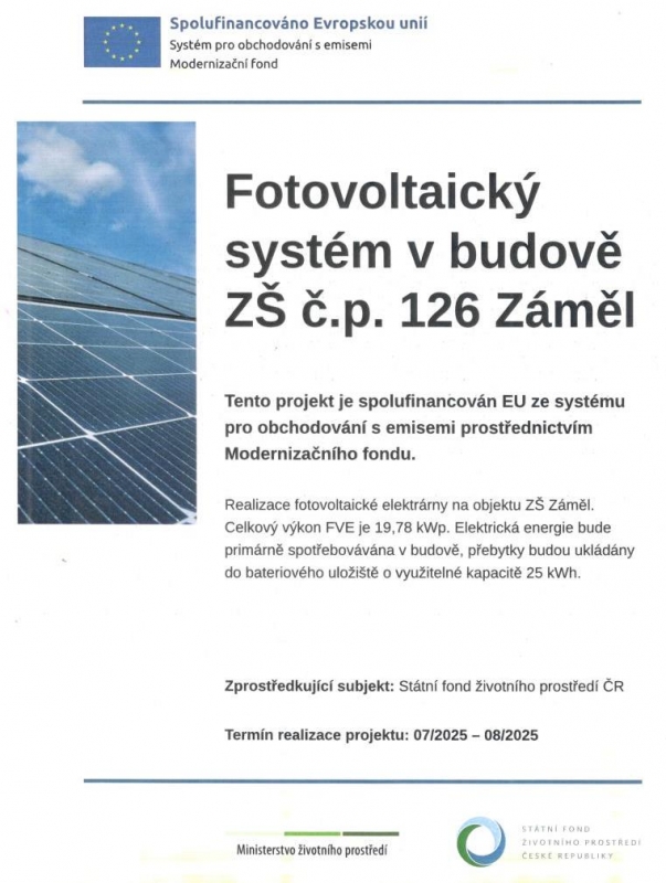 | Přílohy | Tento projekt je spolufinancován EU ze systému pro opbchodování s emisemi prostřednictvím Modernizačního fondu. Realizace fotovoltaické elektrárny na objektu ZŠ Záměl. Celkový výkon FVE je 19,78 kWp. Elektrická energie bude primárně spotřebována v budově, přebytky budou ukládány do bateriového uložiště o využitelné kapacitě 25 kWh.